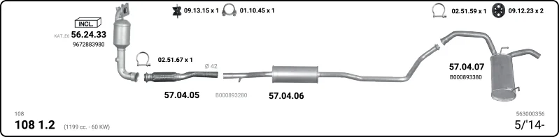PEUGEOT 108 1.2 - Výfukový systém - kompletní od 5/2014, 1199 ccm, 60 kW, 82 hp, HMT (EB2D), HMZ (EB2), HMZ (EB2F), Šikmá zadní část