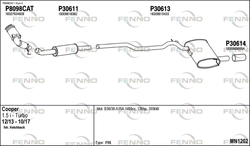MINI MINI (F55) Cooper - Výfukový systém - kompletní od 9/2013, 1499 ccm, 100 kW, 136 hp, B36 A15 A, B38 A15 A, B38 A15 F, Šikmá zadní část