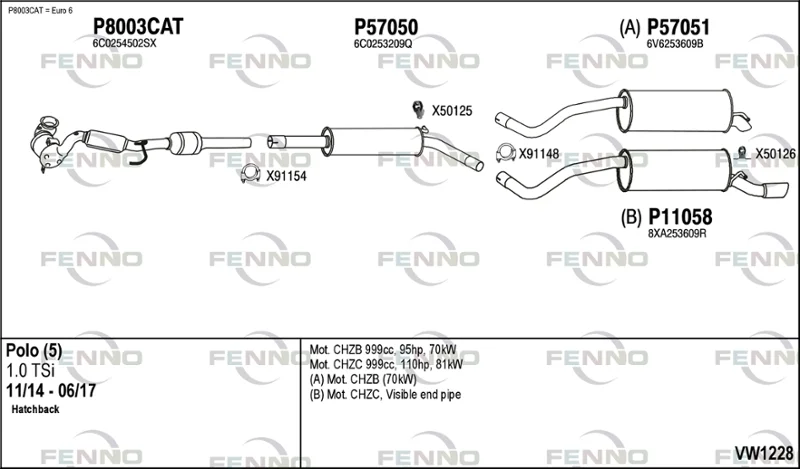 VW POLO V (6R1, 6C1) 1.0 TSI - Výfukový systém - kompletní od 11/2014 do 10/2017, 999 ccm, 70 kW, 95 hp, CHZB, Šikmá zadní část