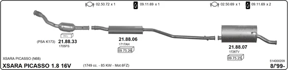 CITROËN XSARA PICASSO (N68) 1.8 16V - Výfukový systém - kompletní od 2/2000 do 8/2005, 1749 ccm, 85 kW, 115 hp, 6FZ (EW7J4), velkoprostorová limuzína