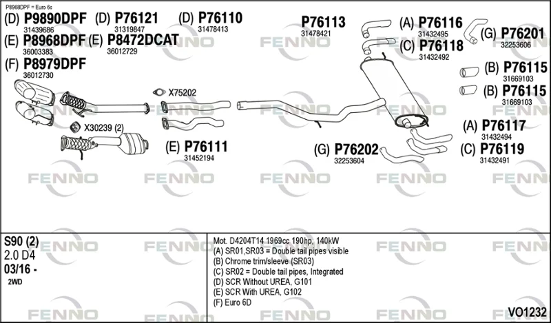 VOLVO S90 II (234) D4 - Výfukový systém - kompletní od 3/2016 do 12/2021, 1969 ccm, 140 kW, 190 hp, D 4204 T14, limuzína