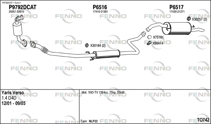 TOYOTA YARIS VERSO VAN (_P2_) 1.4 D4d (NLP22_) - Výfukový systém - kompletní od 10/2001 do 9/2005, 1364 ccm, 55 kW, 75 hp, 1ND-TV, Schránky/šikmá záď