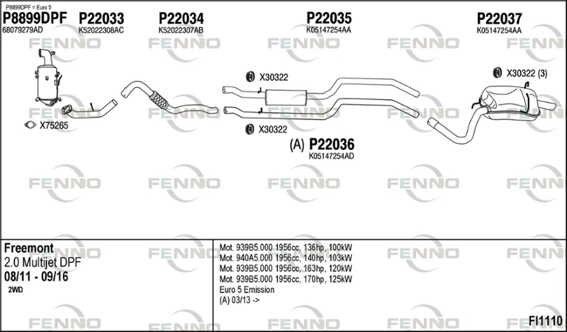 FIAT FREEMONT (345_) 2.0 JTD - Výfukový systém - kompletní od 8/2011 do 12/2015, 1956 ccm, 100 kW, 136 hp, 939 B5.000, velkoprostorová limuzína