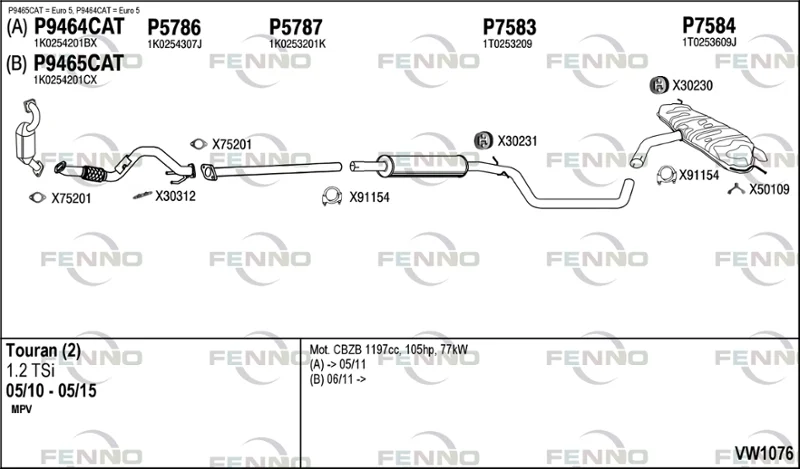 VW TOURAN VAN (1T3) 1.2 TSI - Výfukový systém - kompletní od 5/2010 do 5/2015, 1197 ccm, 77 kW, 105 hp, CBZB, Skříňová/velkoprostorová limuzína