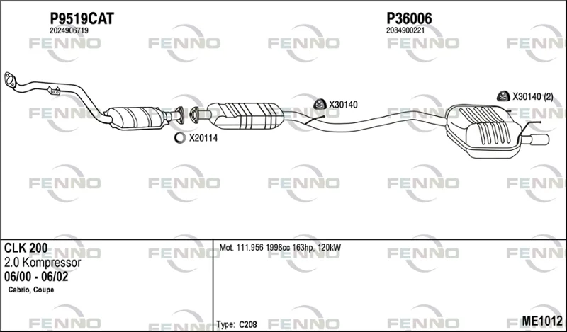MERCEDES-BENZ CLK Kabriolet (A208) CLK 200 Kompressor (208.444) - Výfukový systém - kompletní od 6/2000 do 3/2002, 1998 ccm, 120 kW, 163 hp, M 111.956, Kabriolet