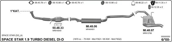 MITSUBISHI SPACE STAR velkoprostorová limuzína (DG_A) 1.9 DI-D (DG4A) - Výfukový systém - kompletní od 2/2001 do 12/2004, 1870 ccm, 75 kW, 102 hp, F9Q1, velkoprostorová limuzína