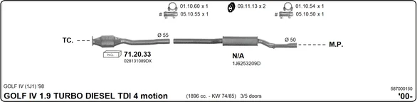 VW GOLF IV (1J1) 1.9 TDI 4motion - Výfukový systém - kompletní od 9/2000 do 6/2005, 1896 ccm, 74 kW, 101 hp, ATD, Šikmá zadní část
