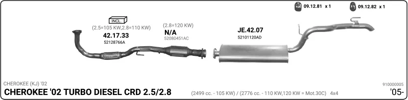 JEEP CHEROKEE (KJ) 2.5 CRD 4x4 - Výfukový systém - kompletní od 9/2001 do 1/2008, 2499 ccm, 105 kW, 143 hp, ENJ, R 425 DOHC, uzavřený terénní vůz