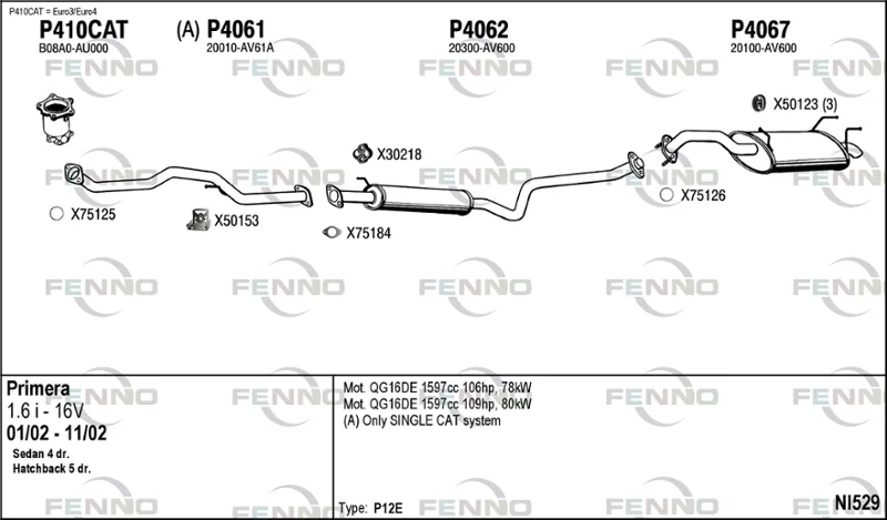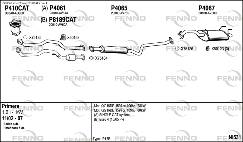 NISSAN PRIMERA (P12) 1.6 - Výfukový systém - kompletní od 3/2002 do 8/2008, 1597 ccm, 78 kW, 106 hp, QG16DE, limuzína