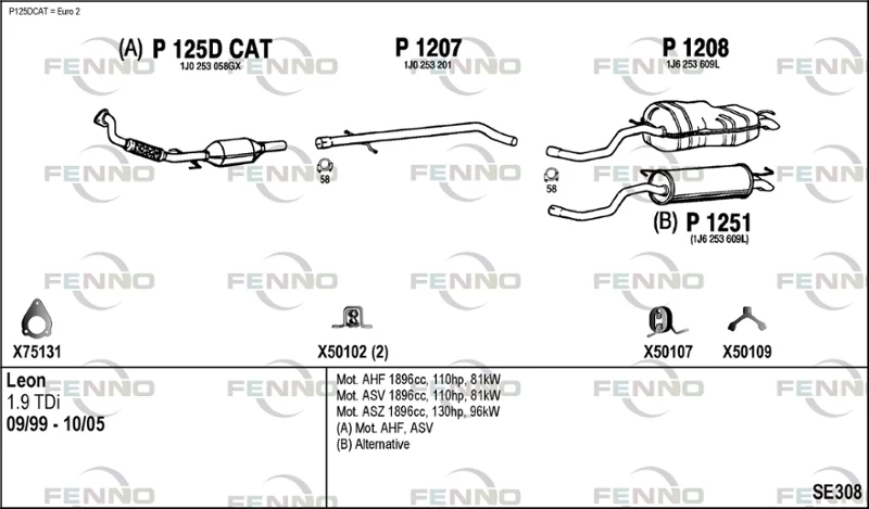 SEAT LEON (1M1) 1.9 TDI - Výfukový systém - kompletní od 5/2003 do 6/2006, 1896 ccm, 96 kW, 130 hp, ASZ, Šikmá zadní část