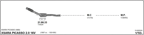 CITROËN XSARA PICASSO (N68) 2.0 16V - Výfukový systém - kompletní od 1/2003 do 6/2012, 1997 ccm, 100 kW, 136 hp, RFN (EW10J4), velkoprostorová limuzína