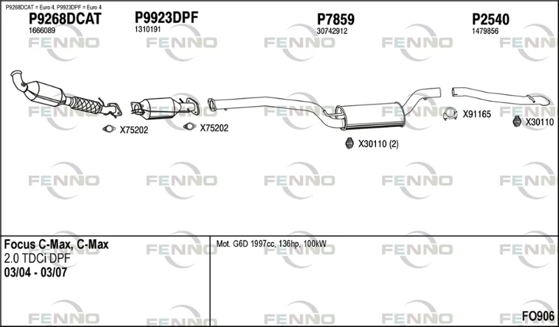 FORD FOCUS C-MAX (DM2) 2.0 TDCi - Výfukový systém - kompletní od 10/2003 do 3/2007, 1997 ccm, 100 kW, 136 hp, G6DA, G6DB, G6DD, G6DG, velkoprostorová limuzína