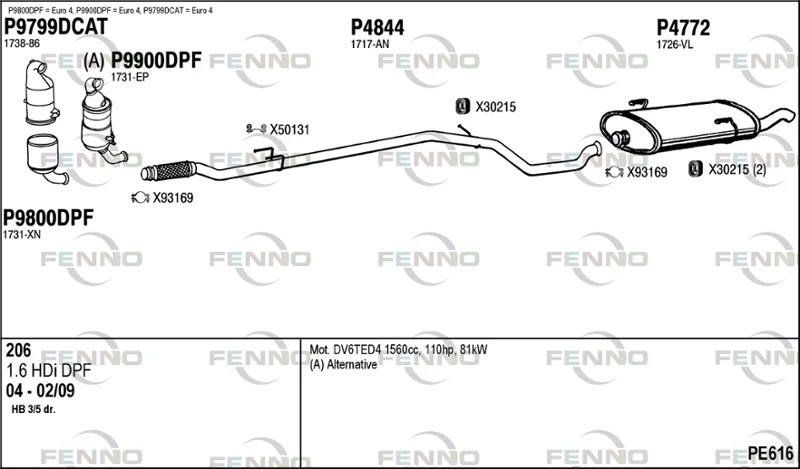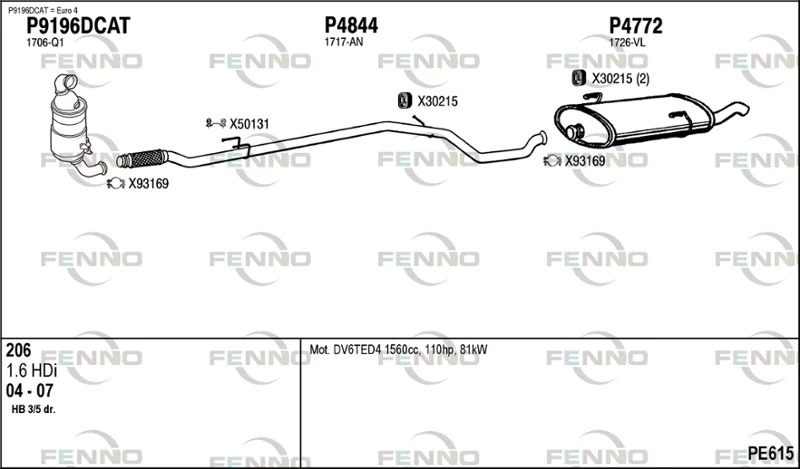 PEUGEOT 206 Šikmá zadní část (2A/C) 1.6 HDi 110 - Výfukový systém - kompletní od 5/2004 do 2/2007, 1560 ccm, 80 kW, 109 hp, 9HY (DV6TED4), 9HZ (DV6TED4), Šikmá zadní část