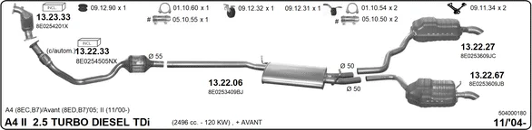 AUDI A4 B7 (8EC) 2.5 TDI - Výfukový systém - kompletní od 11/2004 do 5/2006, 2496 ccm, 120 kW, 163 hp, BDG, limuzína