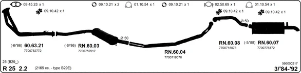 RENAULT 25 (B29_) 2.2 (B29E) - Výfukový systém - kompletní od 4/1984 do 12/1989, 2165 ccm, 89 kW, 121 hp, J7T 706, J7T 707, J7T 714, J7T 715, Šikmá zadní část