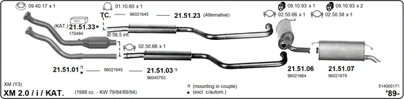 CITROËN XM (Y3) 2.0 i - Výfukový systém - kompletní od 5/1989 do 6/1994, 1998 ccm, 89 kW, 121 hp, RFZ (XU10J2), Šikmá zadní část