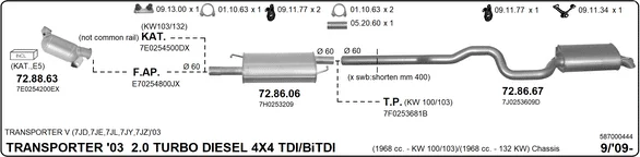 VW TRANSPORTER T5 valník/podvozek (7JD, 7JE, 7JL, 7JY, 7JZ, 7FD 2.0 TDI 4motion - Výfukový systém - kompletní od 5/2010 do 8/2015, 1968 ccm, 100 kW, 136 hp, CAAE, CCHB, valník/podvozek