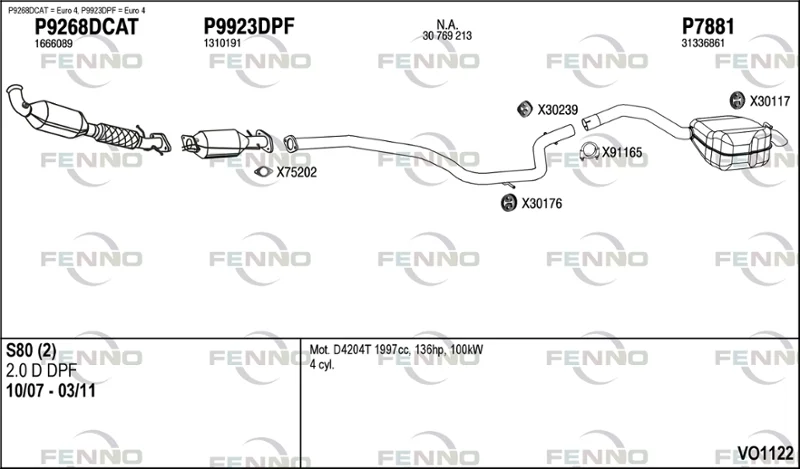 VOLVO S80 II (124) 2.0 TDi - Výfukový systém - kompletní od 2/2008 do 3/2011, 1998 ccm, 100 kW, 136 hp, D 4204 T, limuzína