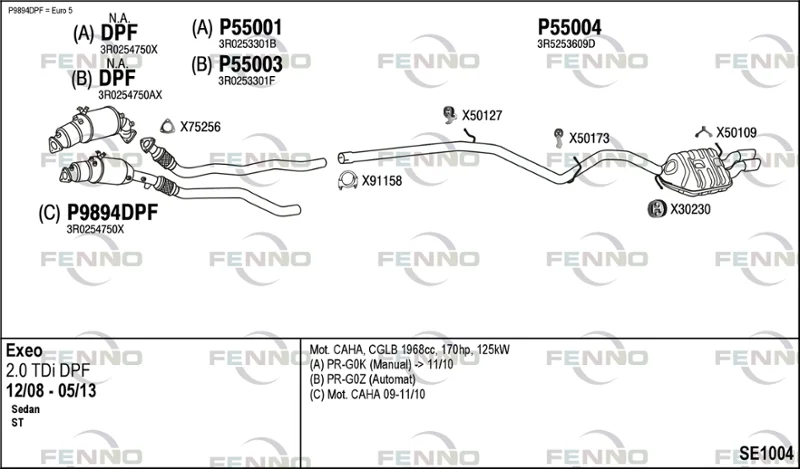 SEAT EXEO (3R2) 2.0 TDI - Výfukový systém - kompletní od 2/2009 do 5/2013, 1968 ccm, 125 kW, 170 hp, CAHA, CGLB, limuzína