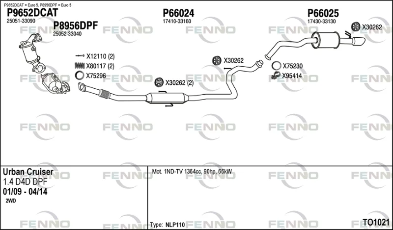 TOYOTA URBAN CRUISER (_P1_) 1.4 D-4D (NLP110_, NLP110R) - Výfukový systém - kompletní od 1/2009 do 4/2014, 1364 ccm, 66 kW, 90 hp, 1ND-TV, Šikmá zadní část