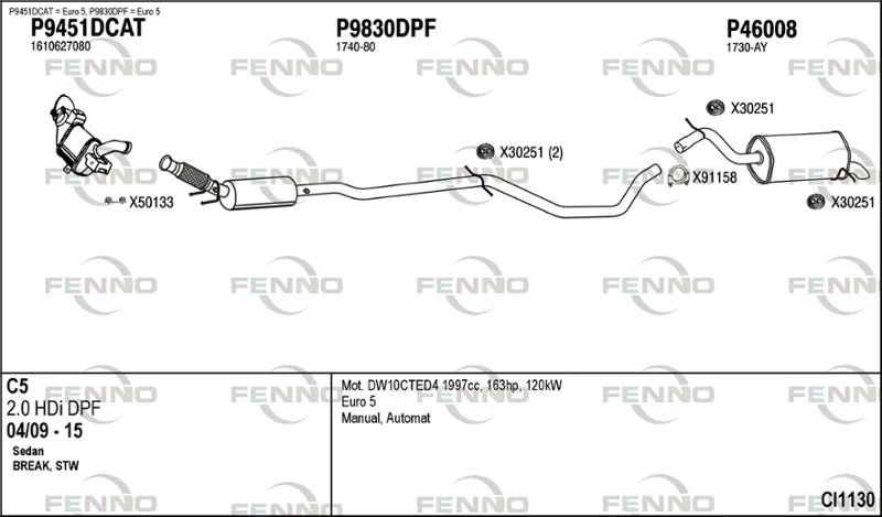 CITROËN C5 III Break (RW_) 2.0 HDi 165 - Výfukový systém - kompletní od 4/2009 do 7/2016, 1997 ccm, 120 kW, 163 hp, RHH (DW10CTED4), kombi
