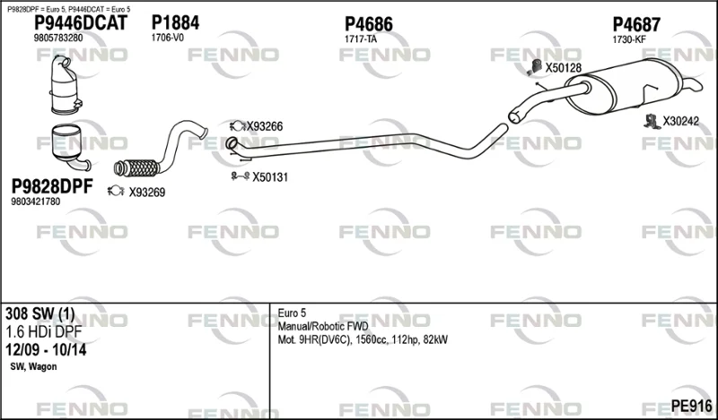 PEUGEOT 308 SW I (4E_, 4H_) 1.6 HDi - Výfukový systém - kompletní od 12/2009 do 10/2014, 1560 ccm, 82 kW, 112 hp, 9HR (DV6C), kombi