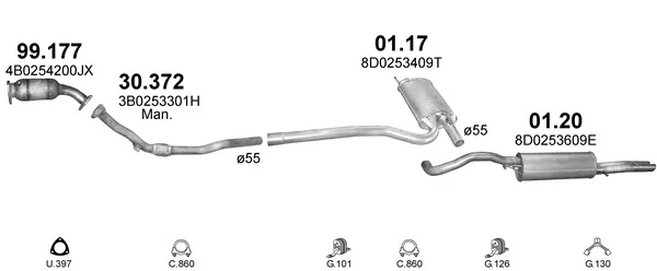 AUDI A4 B5 (8D2) 1.8 T - Výfukový systém - kompletní od 1/1995 do 11/2000, 1781 ccm, 110 kW, 150 hp, AEB, ANB, APU, ARK, ATW, AWT, limuzína