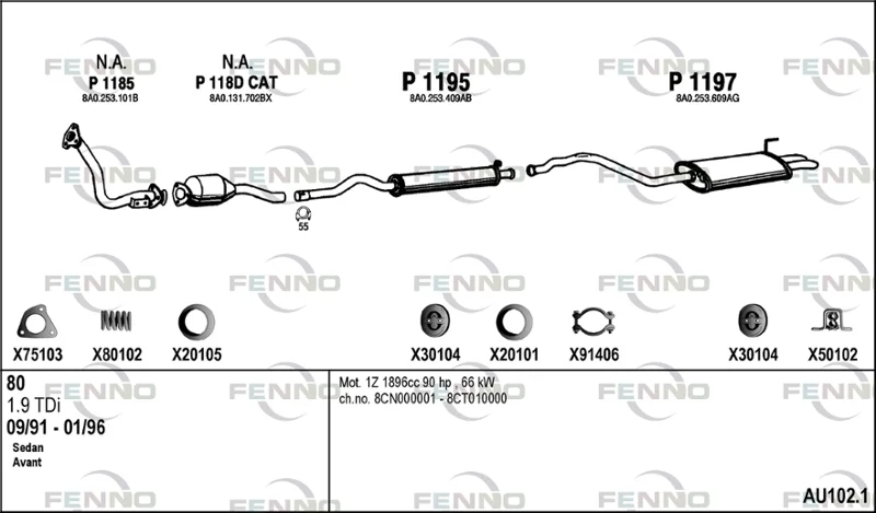 AUDI 80 B4 Avant (8C5) 1.9 TDI - Výfukový systém - kompletní od 7/1992 do 1/1996, 1896 ccm, 66 kW, 90 hp, 1Z, kombi