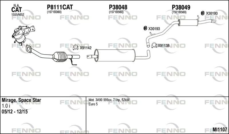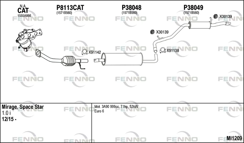 MITSUBISHI MIRAGE / SPACE STAR VI Šikmá zadní část (A0_A) 1.0 (A05A) - Výfukový systém - kompletní od 5/2012, 999 ccm, 52 kW, 71 hp, 3A90, Šikmá zadní část