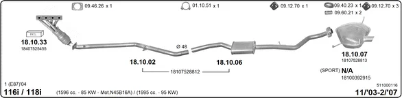 BMW 1 (E87) 118 i - Výfukový systém - kompletní od 7/2004 do 2/2007, 1995 ccm, 95 kW, 129 hp, N46 B20 B, Šikmá zadní část