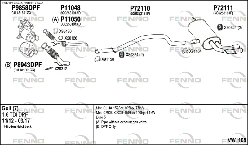 VW GOLF VII (5G1, BQ1, BE1, BE2) 1.6 TDI 4motion - Výfukový systém - kompletní od 1/2013 do 3/2017, 1598 ccm, 81 kW, 110 hp, CRKB, CXXB, Šikmá zadní část