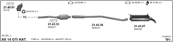 CITROËN AX (ZA-_) 1.4 GTi - Výfukový systém - kompletní od 6/1991 do 12/1996, 1360 ccm, 69 kW, 94 hp, KFZ (TU3FJ2/Z), Šikmá zadní část