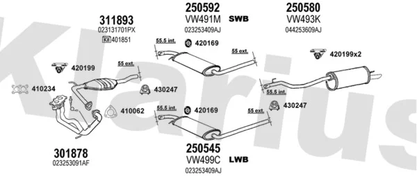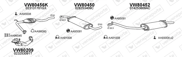 VW TRANSPORTER T4 valník/podvozek (70E, 70L, 70M, 7DE, 7DL, 7DM 2.5 - Výfukový systém - kompletní od 11/1990 do 4/2003, 2461 ccm, 81 kW, 110 hp, AAF, ACU, AEN, AEU, valník/podvozek