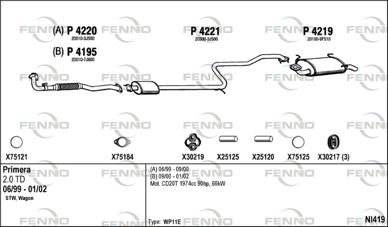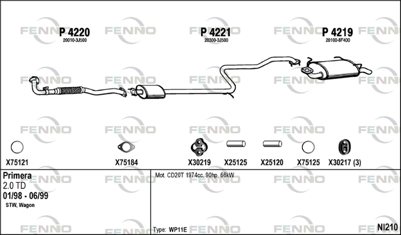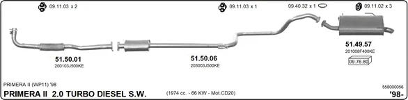 NISSAN PRIMERA Traveller (WP11) 2.0 TD - Výfukový systém - kompletní od 4/1998 do 12/2001, 1974 ccm, 66 kW, 90 hp, CD20T, kombi