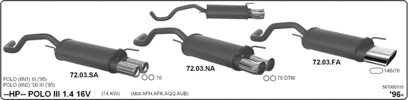 VW POLO (6N2) 1.4 16V - Sportovní tlumič hluku od 10/1999 do 9/2001, 1390 ccm, 74 kW, 101 hp, AFK, AQQ, AUB, Šikmá zadní část
