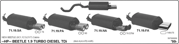 VW NEW BEETLE (9C1, 1C1) 1.9 TDI - Sportovní tlumič hluku od 2/2001 do 9/2010, 1896 ccm, 74 kW, 101 hp, ATD, AXR, BEW, Šikmá zadní část