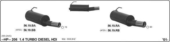 PEUGEOT 206 Šikmá zadní část (2A/C) 1.4 HDi eco 70 - Sportovní tlumič hluku od 9/2001 do 4/2009, 1398 ccm, 50 kW, 68 hp, 8HX (DV4TD), 8HZ (DV4TD), Šikmá zadní část