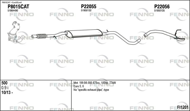 FIAT 500 (312_) 0.9 (312AXM1B) - Výfukový systém - kompletní od 10/2013, 875 ccm, 77 kW, 105 hp, 199 B6.000, Šikmá zadní část