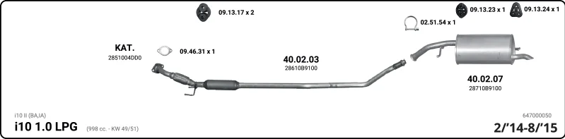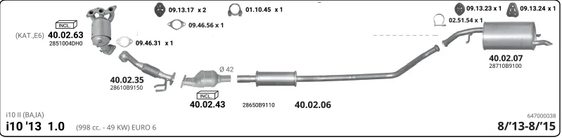 HYUNDAI i10 II (BA, IA) 1.0 LPG - Výfukový systém - kompletní od 2/2014 do 12/2019, 998 ccm, 49 kW, 67 hp, B3LA, Šikmá zadní část
