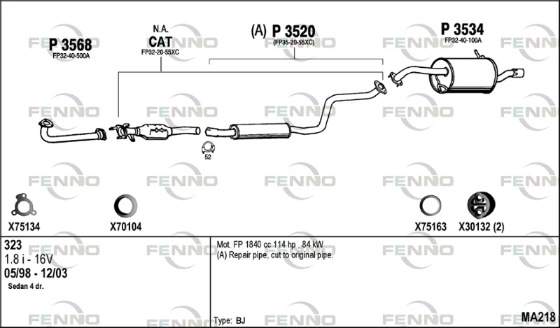 MAZDA 323 S VI limuzína (BJ) 1.9 16V (BJ10M) - Výfukový systém - kompletní od 9/1998 do 5/2004, 1840 ccm, 84 kW, 114 hp, FP, FP55, limuzína