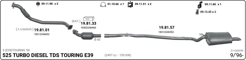 BMW 5 Touring (E39) 525 tds - Výfukový systém - kompletní od 3/1997 do 5/2004, 2497 ccm, 105 kW, 143 hp, M51 D25 (256T1), kombi