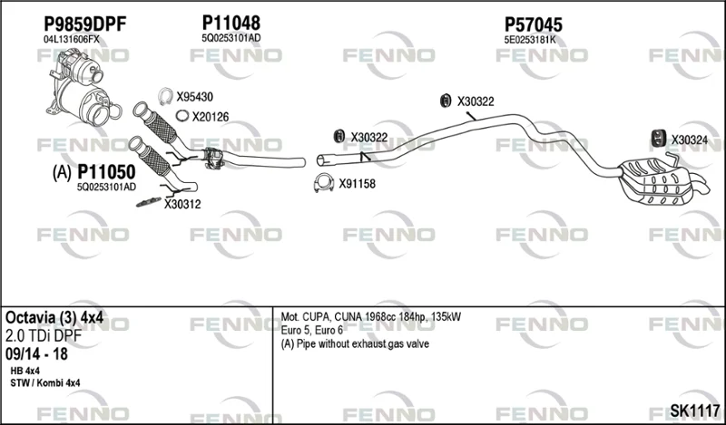 SKODA OCTAVIA III (5E3, NL3, NR3) 2.0 TDI / TDI RS 4x4 - Výfukový systém - kompletní od 5/2013 do 10/2020, 1968 ccm, 135 kW, 184 hp, CUNA, CUPA, DJGA, Šikmá zadní část