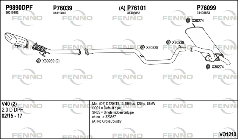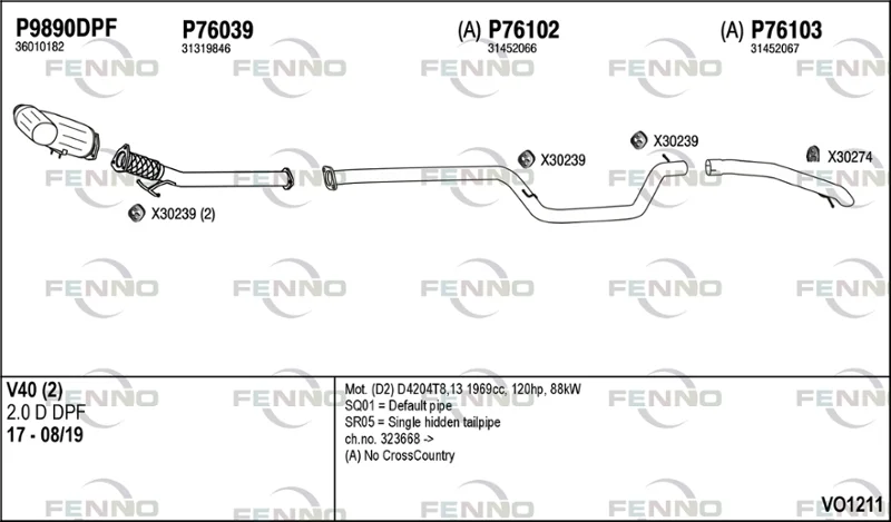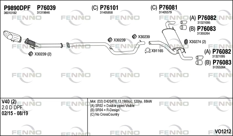VOLVO V40 Šikmá zadní část (525) D2 - Výfukový systém - kompletní od 2/2015 do 8/2019, 1969 ccm, 88 kW, 120 hp, D 4204 T13, D 4204 T8, Šikmá zadní část