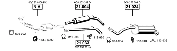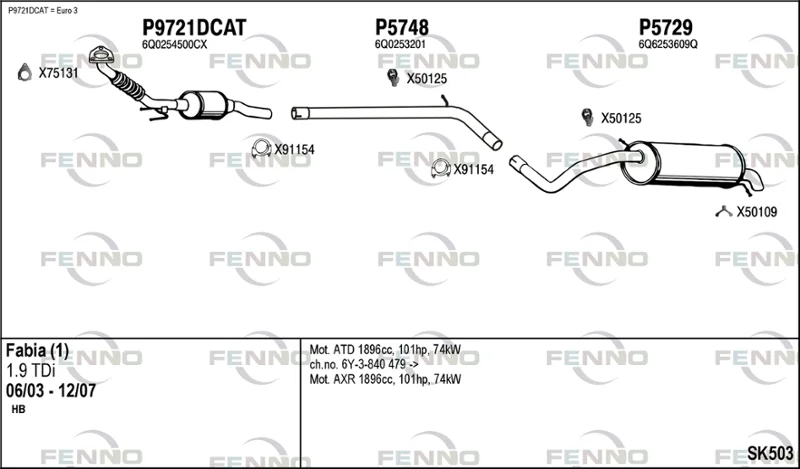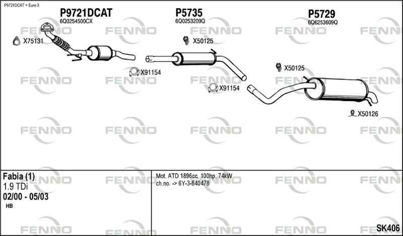 SKODA FABIA I (6Y2) 1.9 TDI - Výfukový systém - kompletní od 1/2000 do 3/2008, 1896 ccm, 74 kW, 100 hp, ATD, AXR, Šikmá zadní část