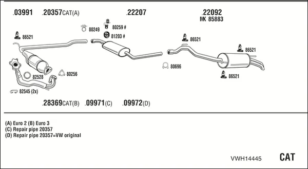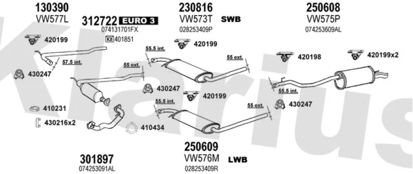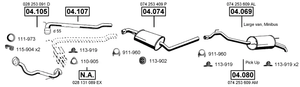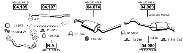 VW TRANSPORTER T4 Krabice (70A, 70H, 7DA, 7DH) 2.5 TDI - Výfukový systém - kompletní od 12/1998 do 4/2003, 2461 ccm, 65 kW, 88 hp, AJT, AYY, Krabice