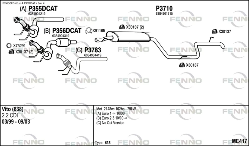 MERCEDES-BENZ V-CLASS Krabice (638/2) V 200 (638.294) - Výfukový systém - kompletní od 3/1999 do 7/2003, 2148 ccm, 75 kW, 102 hp, OM 611.980, Krabice
