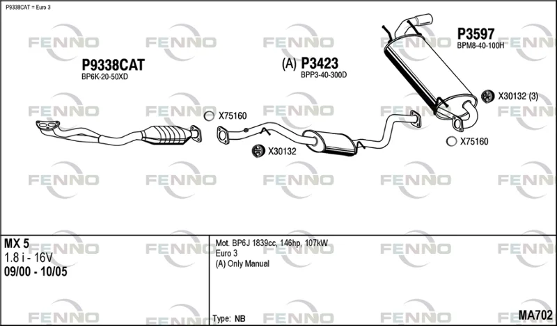 MAZDA MX-5 II (NB) 1.8 16V (NB8C) - Výfukový systém - kompletní od 11/2000 do 10/2005, 1840 ccm, 102 kW, 139 hp, BP6J, Kabriolet