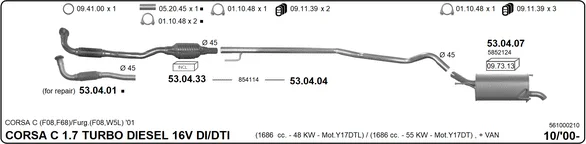 OPEL CORSA C Schránky/šikmá záď (X01) 1.7 DTI 16V (F08, W5L) - Výfukový systém - kompletní od 9/2000 do 7/2003, 1686 ccm, 55 kW, 75 hp, Y 17 DT, Schránky/šikmá záď
