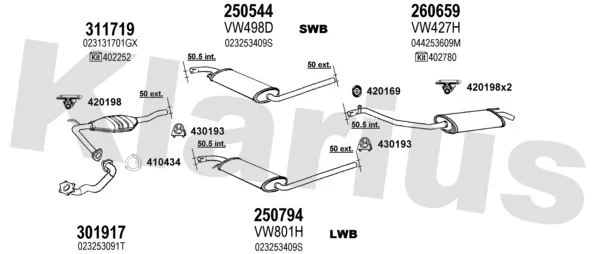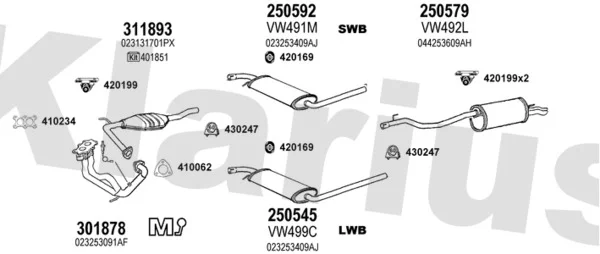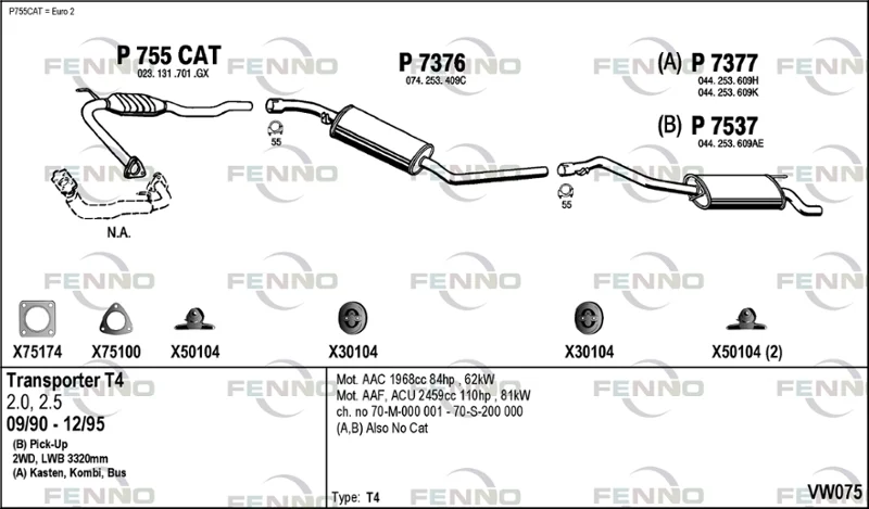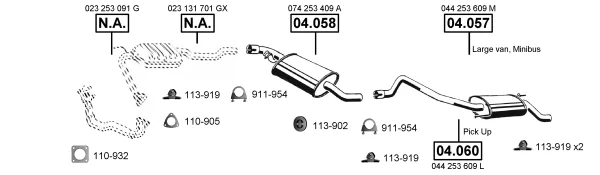 VW TRANSPORTER T4 autobus (70B, 70C, 7DB, 7DK, 70J, 70K, 7DC, 7 2.5 - Výfukový systém - kompletní od 9/1990 do 6/2003, 2461 ccm, 81 kW, 110 hp, AAF, ACU, AEN, AEU, autobus