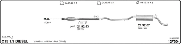 CITROËN C15 Skříňová/velkoprostorová limuzína (VD_) 1.9 D - Výfukový systém - kompletní od 12/2000 do 12/2005, 1868 ccm, 44 kW, 60 hp, WJX (DW8B), Skříňová/velkoprostorová limuzína